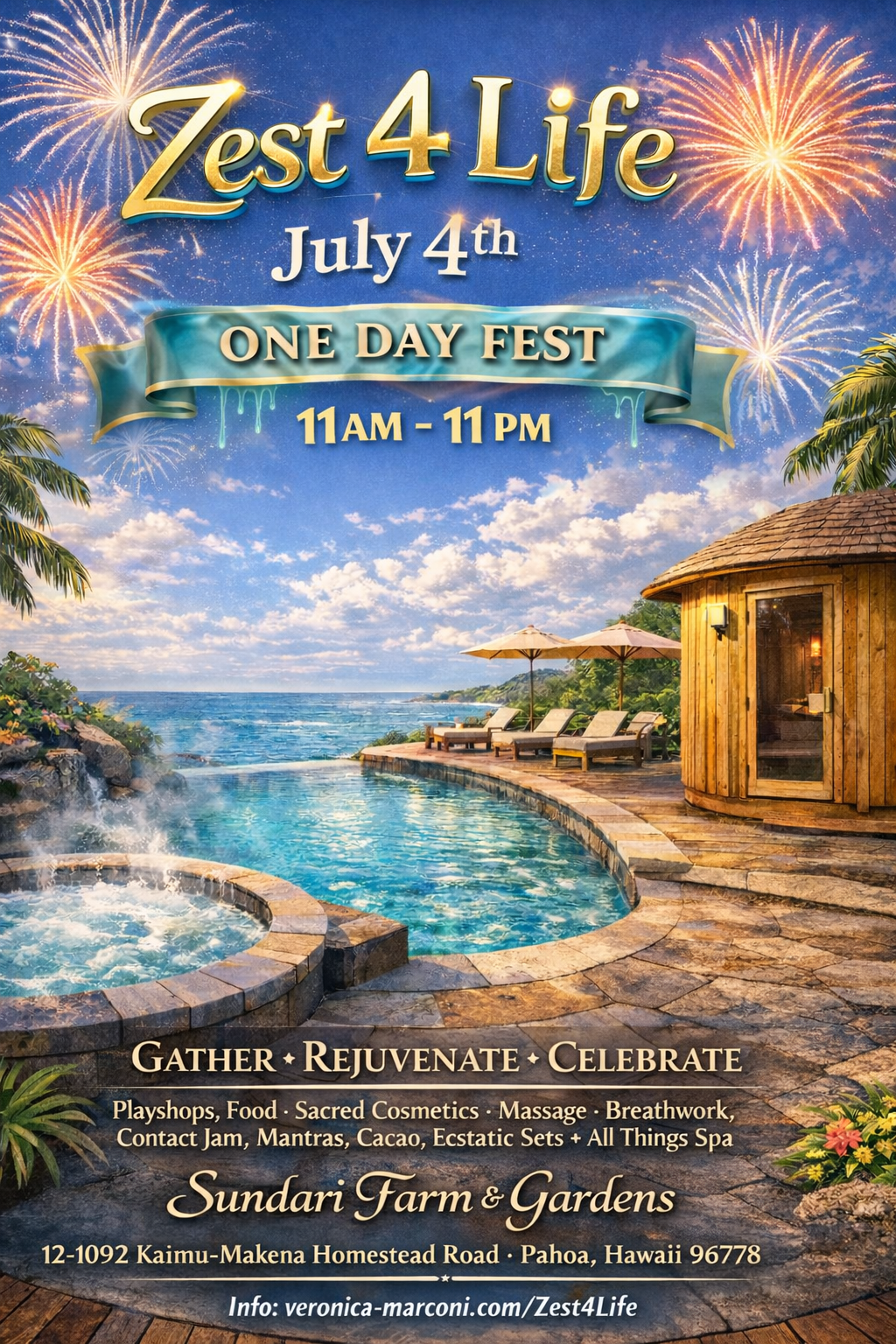 Zest4Life is a one-day festival centered on celebration, rejuvenation and connection set in the dreamy setting of Sundari Spa. Running from 11am to 11pm guests are invited to flow between spa relaxation and vibrant community experiences. Enjoy playshops, breathwork, massage, contact jams, mantras, cacao meditation, and ecstatic live DJ sets from 3 of our beloved island DJs. Food, elixirs, and sacred island cosmetics are available for purchase. Access to all things spa are included, hot tub, sauna, cold plunge, ocean view swimming pool. On July 4th 2026